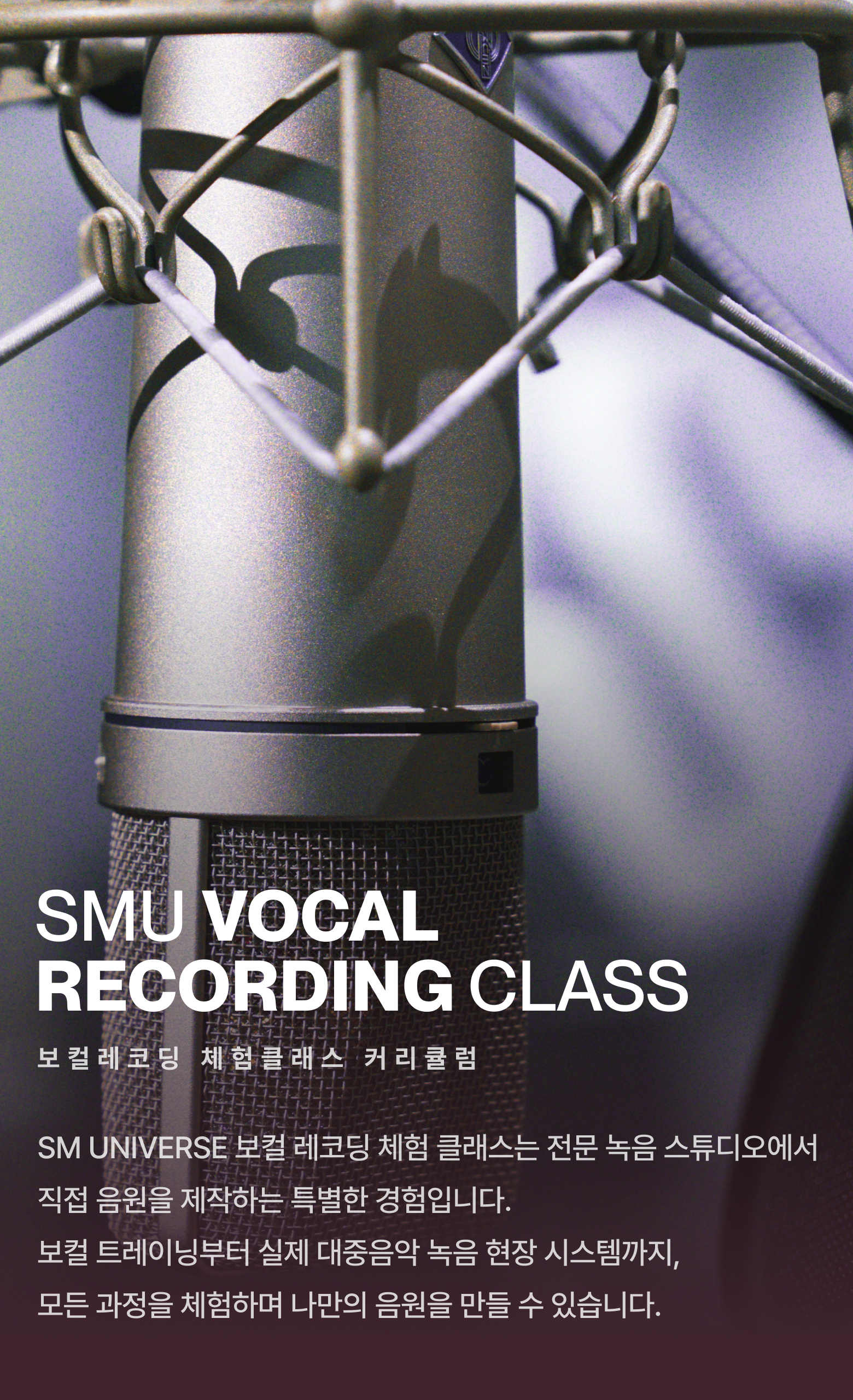 보컬 트레이닝을 바탕으로 보컬 선생님의 디렉팅에 따라 녹음하며, 이후 엔지니어의 피드백을 통해 녹음을 마무리하여 최종 결과물을 만들어냅니다. SMU 보컬 레코딩 체험 클래스는 여러분만의 음원을 만들어보는 소중한 기회가 될 것입니다.